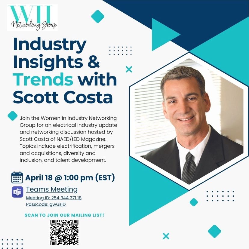 Join the Women in Industry Networking Group for an electrical industry update and networking discussion hosted by Scott Costa of NAED/tED Magazine. Topics include electrification, mergers and acquisitions, diversity and inclusion, and talent development.